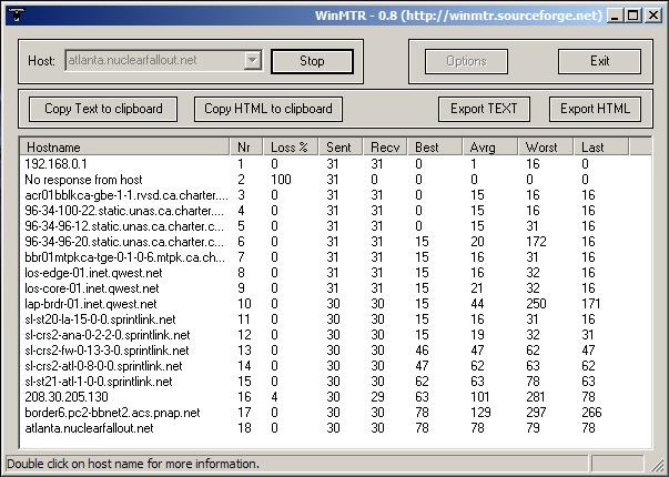 5. Generally its best to leave the options set the way they are for testing purposes. In the "Host" field at the top, type in the IP or address to the server you are testing without the port number (such as atlanta.nuclearfallout.net or 64.94.238.5) and then click the "Start" button. You should see a screen like this: