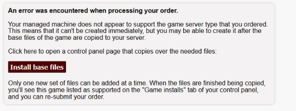 This 100% normal and just means that your managed machine does not have the base files installed. Go ahead and press the "Install base files" button now. Depending on the type of game you chose the install should take anywhere from 10-30 minutes(you can track its progress via the "Game installs" page in your NFO control panel.