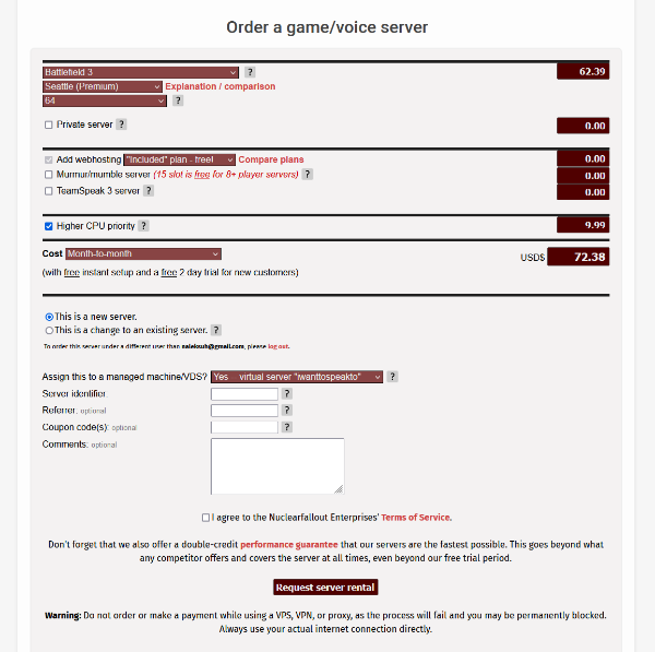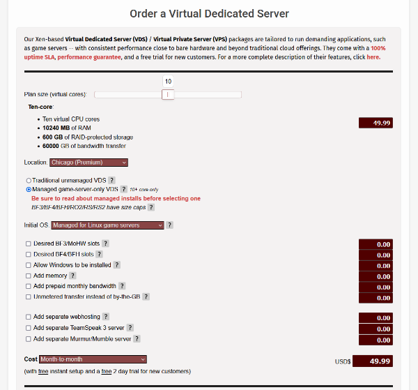 Please be aware that certain games have specific OS requirements and others have an additional fee. Our standard game server pricing will also show on the order page, but will be removed when you proceed to the order confirmation page.