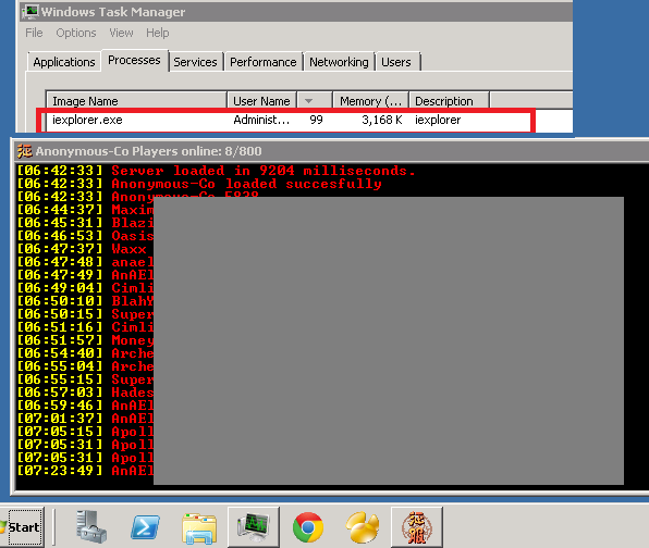 Is the server version of Internet Explorer a different process name? On my windows 7 pc the process name is "iexplore.exe" not "iexplorer.exe".