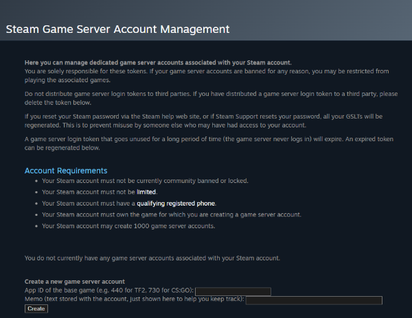 - Visit: https://steamcommunity.com/dev/managegameservershere and login with your Steam details.