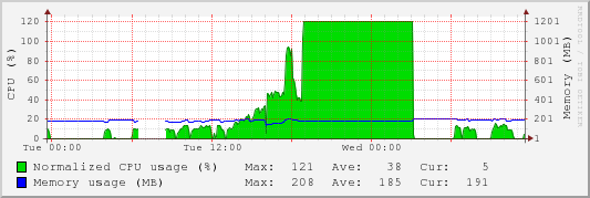 OK, here's another one. This time the CPU was stuck at 121% for hours even while there were NO players.