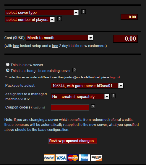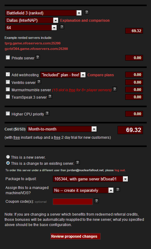 From here you will need to fill out the form with your current server info that was brought up via the Description tab. Only make changes where necessary. As you can see, the only change I have made is to the location. If you have a Ventrilo or Higher CPU priority or second server in your package, don't forget to include them as well or you will lose them. At the bottom be sure to select This is a change to an existing server.