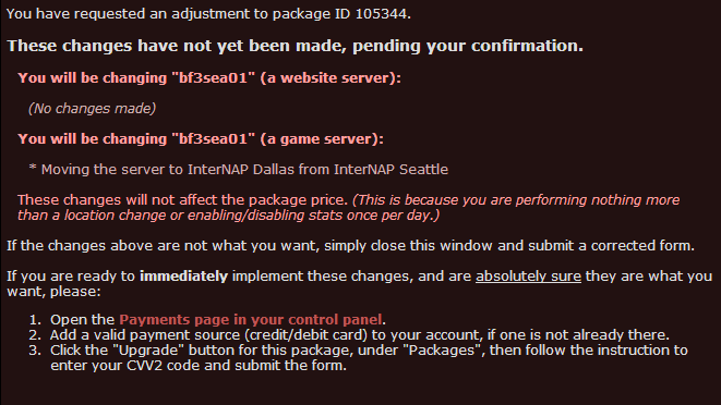 From here you will need to fill out the form with your current server info that was brought up via the Description tab. Only make changes where necessary. As you can see, the only change I have made is to the location. If you have a Ventrilo or Higher CPU priority or second server in your package, don't forget to include them as well or you will lose them. At the bottom be sure to select This is a change to an existing server.