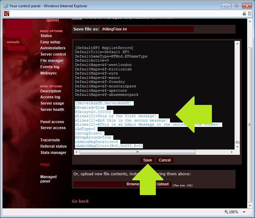 To edit your killing floor config file, click the link called File Manager and then in the 1st drop down box pick your Killing Floor Config file (Default config file is KillingFloor.ini). In the 2nd drop down box pick Edit and then click the Submit button. This should open up an inline editor for changing the file.