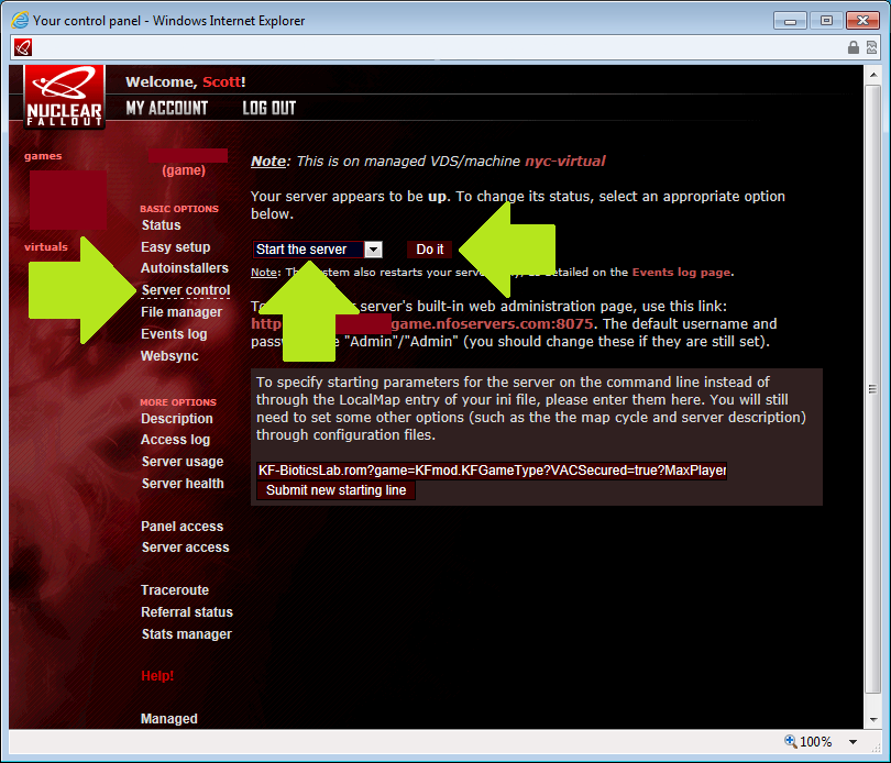 Time to start your server and add some messages. Click on your Server Control link. In the drop down box select Start the server and then press the Do it button.