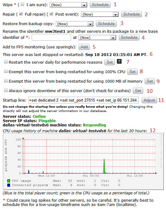 (12) The CPU usage and player graph mirrors the one shown on the "Usage" page of your VDS or dedicated machine and provides at-a-glance information that you can use to quickly track down issues. Seeing a sudden spike in CPU or a sudden drop in players could indicate an issue with your server or some type of attack against your VDS/machine, and might warrant further investigation, starting with the "Usage" page for the overall machine (as it will also show bandwidth and memory information).